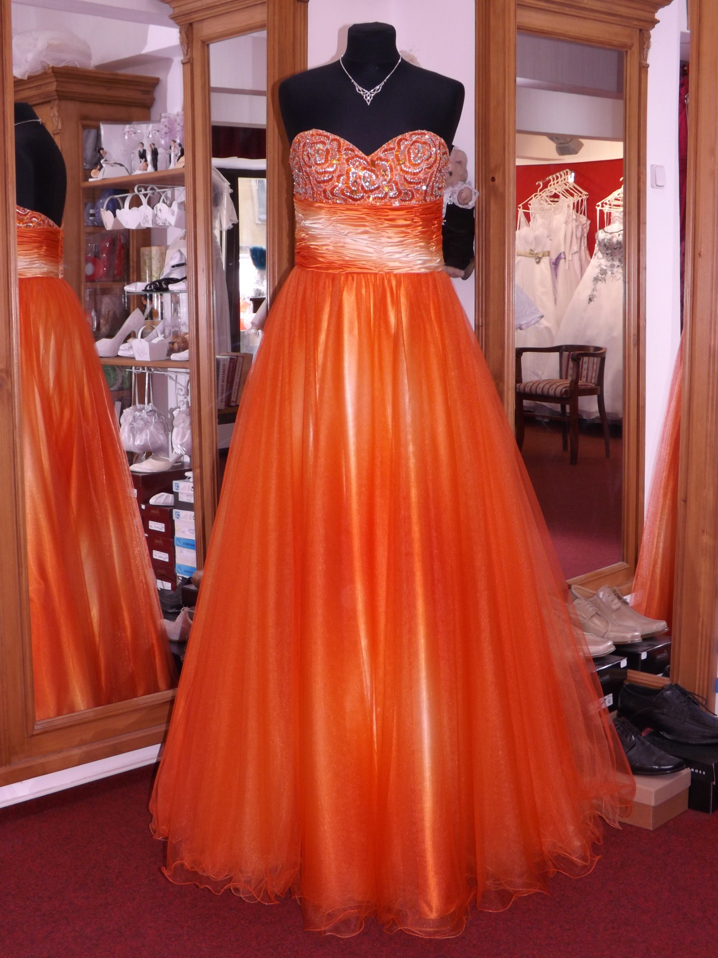 R36 NOVÉ oranžové šaty, korzet zdobený korálky. Vel.38. Vzadu na zip. Materiál : tyl, satén